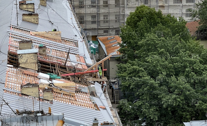 Работники ремонтируют крышу жилого здания в городском районе.Зона занята разбросанными строительными материалами, а деревья обеспечивают зеленый фон