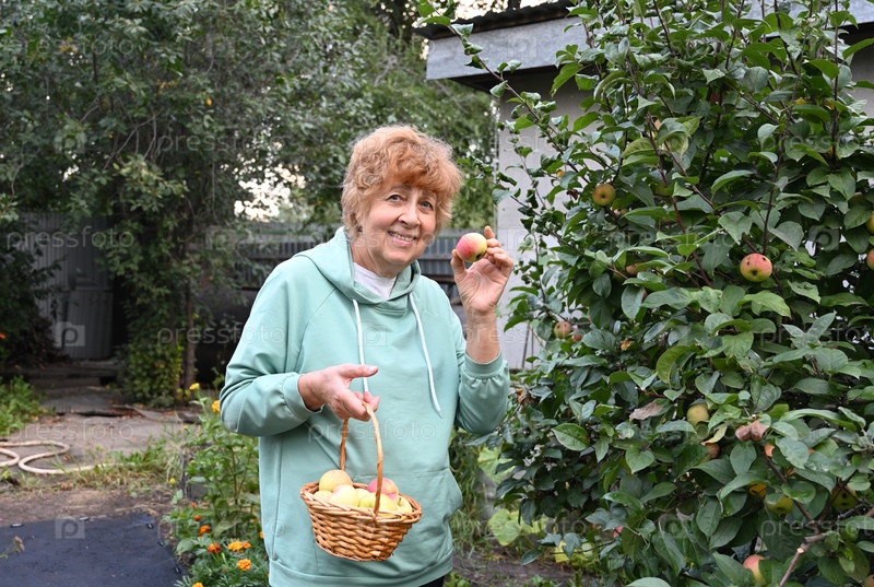Женщина собирает яблоки в саду, держа корзину под облачным небом