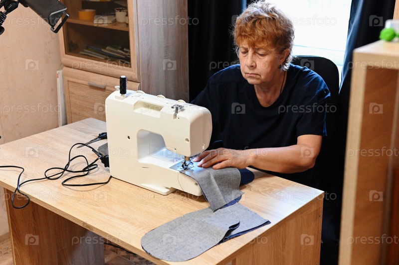 Женщина сидит за деревянным столом, сосредоточенная на использовании швейной машины.Она работает с серой тканью в хорошо освещенном помещении, заполненном мебелью