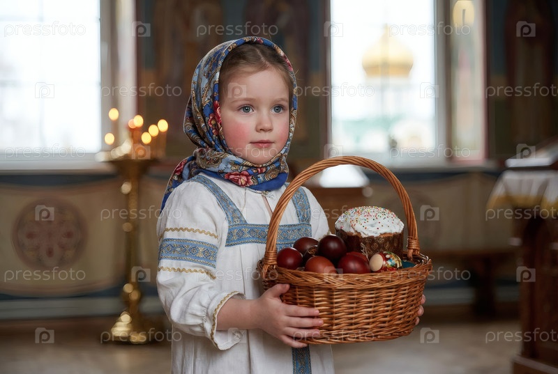Религия и вера.Счастливого Пасхи.Портрет маленькой девочки в русском народном шарфе с плетеновой корзиной пасхальных яиц и пасхального торта внутри церкви