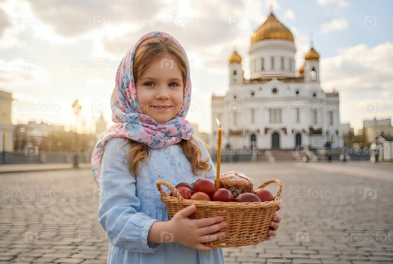 Религия и вера.Счастливая Пасха.Портрет маленькой девочки в русском народном шарфе с плетеновой корзиной пасхальных яиц и пасхальным тортом перед церковью