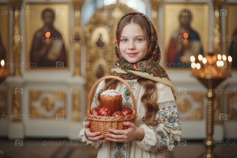 Религия и вера.Счастливого Пасхи.Портрет маленькой девочки в русском народном шарфе с плетеновой корзиной пасхальных яиц и пасхального торта внутри церкви
