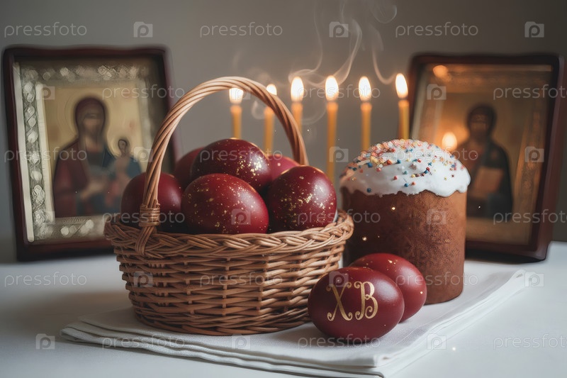 Православная Пасха: пасхальные яйца и пасхальный торт в корзине из плесеня, иконы, лица святых, цветы, церковные свечи и праздничный декор на столе внутри церкви