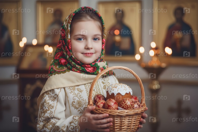 Религия и вера.Счастливого Пасхи.Портрет маленькой девочки в русском народном шарфе с плетеновой корзиной пасхальных яиц и пасхального торта внутри церкви