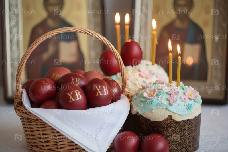 Православная Пасха: пасхальные яйца и пасхальный торт в корзине из плесеня, иконы, лица святых, цветы, церковные свечи и праздничный декор на столе внутри церкви