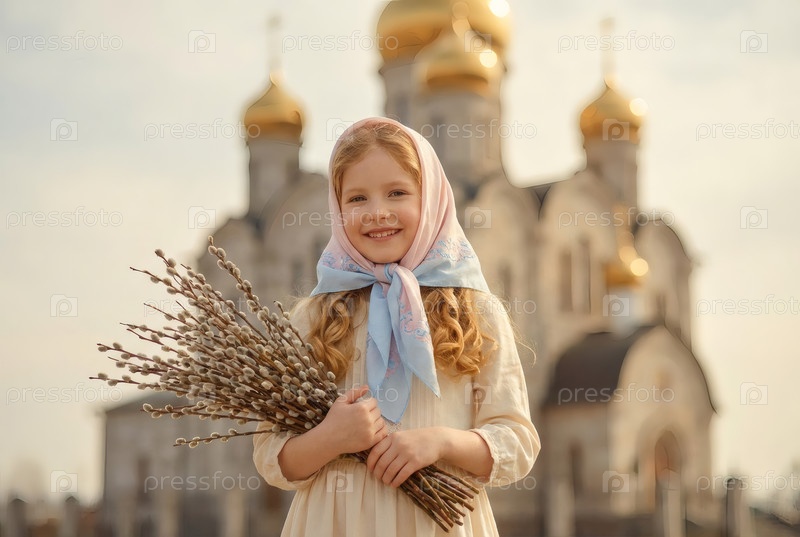 Религия и вера. Пальмовое воскресенье. Портрет маленькой девочки в русском народном плато с букетом верби внутри церкви