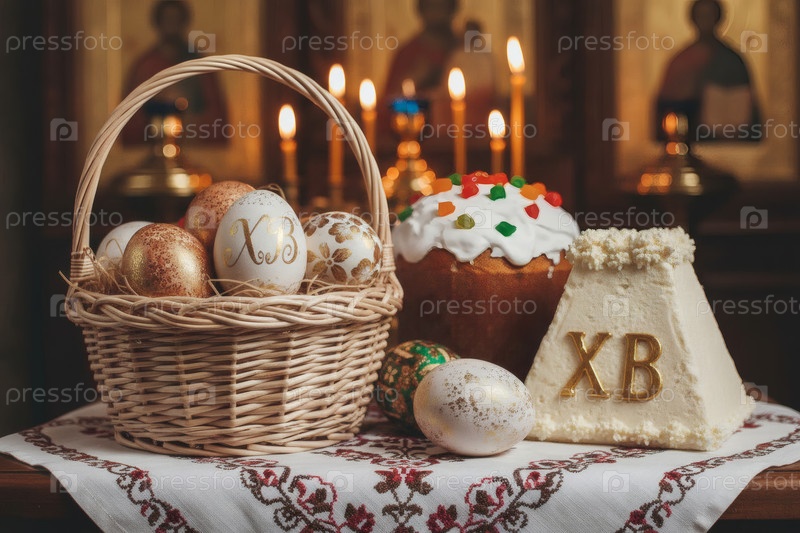 Православная Пасха: пасхальные яйца и пасхальный торт в корзине из плесеня, иконы, лица святых, цветы, церковные свечи и праздничный декор на столе внутри церкви