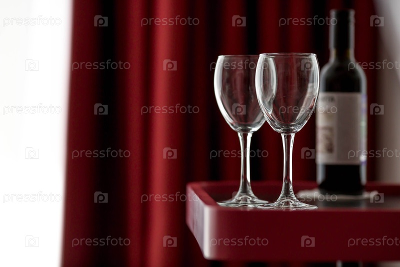 Роскошный, стильный натюрморт.Стеклянные бокалы и бутылка красного вина на бургундском столе.Концепция романтического ужина или вечеринки