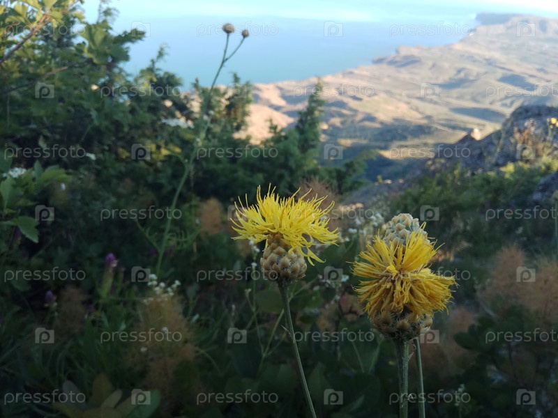 Красивый одинокий желтый цветок купается в лучах солнца, растет возле скалы