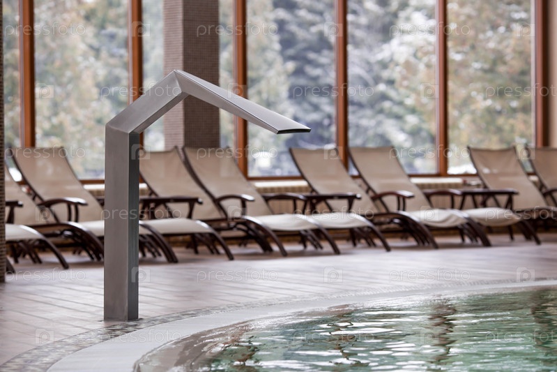 Оборудование в крытом бассейне для массажа спины и шеи перед шезлонгами. Поток воды под высоким давлением. Концепция отдыха, спа-центра и омоложения в курортном отеле. Туризм