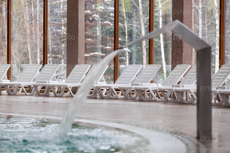 Оборудование в крытом бассейне для массажа спины и шеи перед шезлонгами. Поток воды под высоким давлением. Концепция отдыха, спа-центра и омоложения в курортном отеле. Туризм