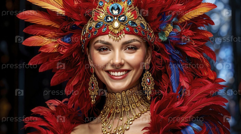 Яркое празднование в ярких перьях и золотых украшениях