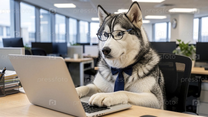 Хаски в деловом костюме за рабочим столом