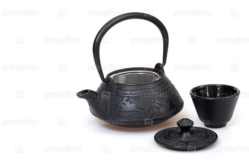 Литой железный китайский чайник изолирован на белом фоне