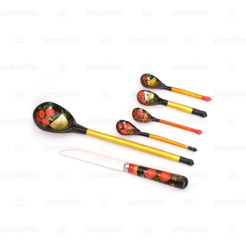 Традиционные русские национальные деревянные окрашенные (так называемые "хохломы") ложки изолированы на белом фоне
