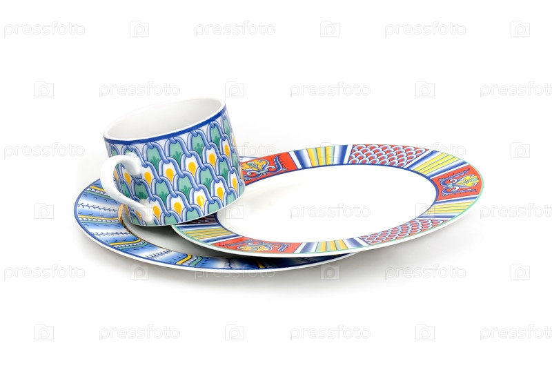 Чашечка и тарелки с средиземноморским орнаментом изолированы на белом фоне