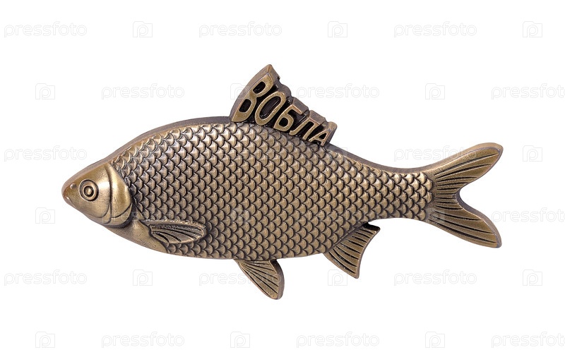 Металлическая золотая рыбка изолирована на белом фоне. русская надпись означает "каспийский таракан". элемент дизайна с резкой тропой