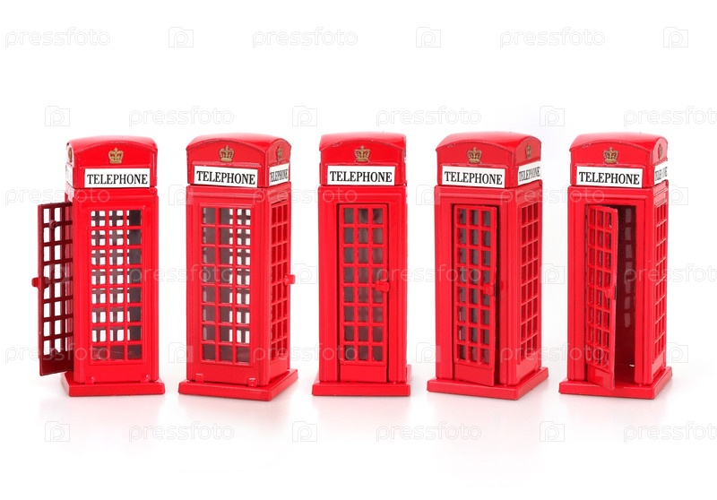 Знаменитая английская красная телефонная будка.Миниатюрный макет изолирован на белом фоне