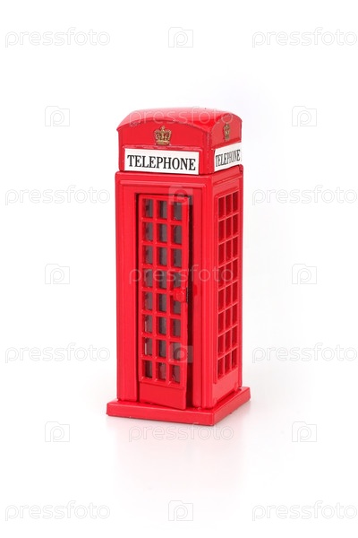 Знаменитая английская красная телефонная будка.Миниатюрный макет изолирован на белом фоне
