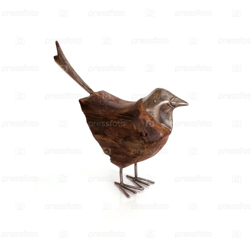 Деревянная и металлическая птица-статуя изолирована на белом фоне