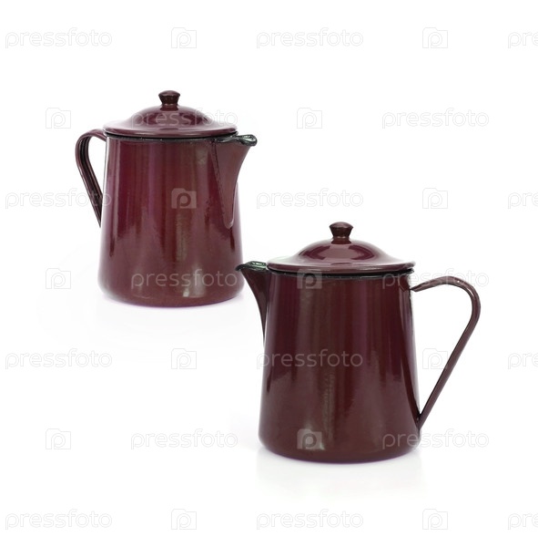 Два винтажных металлических эмалированных кофейных горшка изолированы на белом фоне