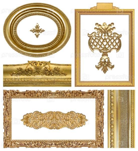 Набор золотых рамок для картин, зеркал или фотографий, изолированных на белом фоне