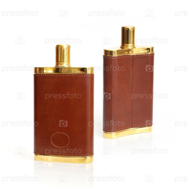 Золотая бутылка бренди с кожаным декором, изолированная на белом фоне