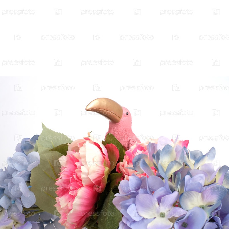 Яркая тропическая птица и цветы изолированы на белом фоне