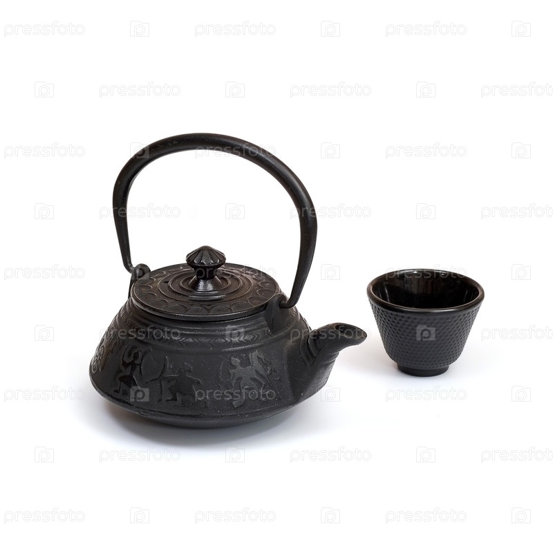 Литой железный китайский чайник изолирован на белом фоне