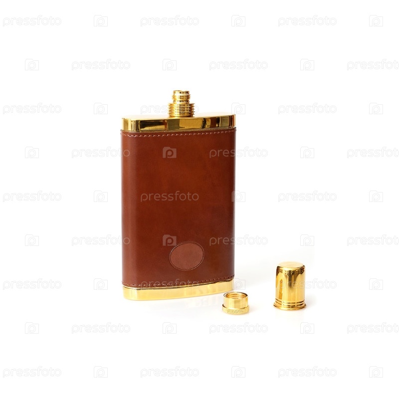 Золотая бутылка бренди с кожаным декором, изолированная на белом фоне
