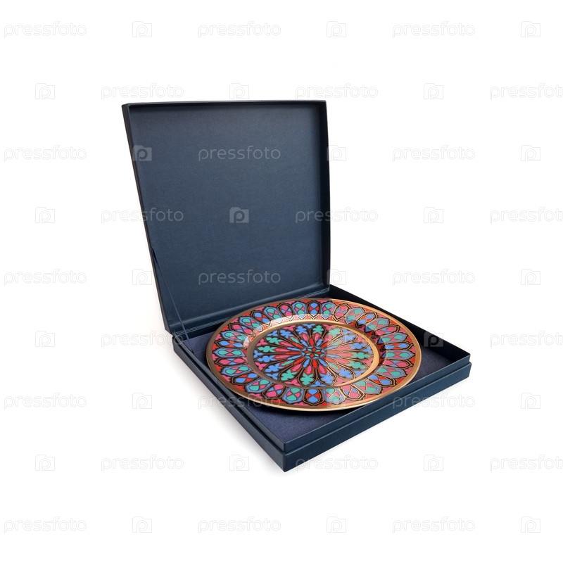 Декоративная фарфоровая тарелка с готическим дизайном в подарочной коробке, изолированной на белом фоне