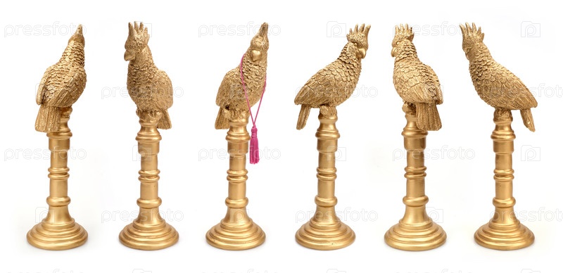 Золотая тропическая птица (папуга на столбе) изолирована на белом фоне