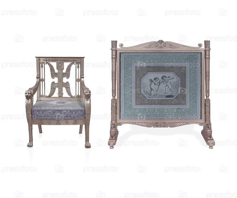 Древнее серебряное кресло и огневой экран изолированы на белом фоне