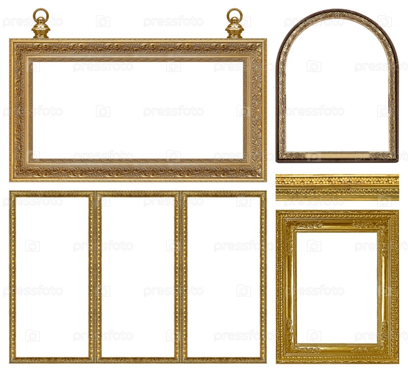Набор золотых рамок для картин, зеркал или фотографий, изолированных на белом фоне