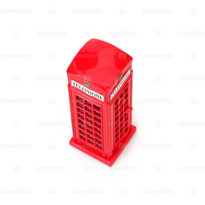 Знаменитая английская красная телефонная будка.Миниатюрный макет изолирован на белом фоне