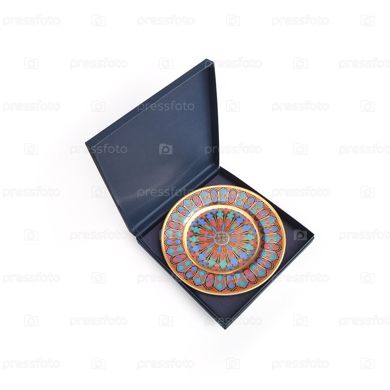 Декоративная фарфоровая тарелка с готическим дизайном в подарочной коробке, изолированной на белом фоне