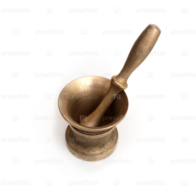 Тяжелый бронзовый миномет с пестилем для измельчения пищевых специй и лекарств, изолированный на белом фоне