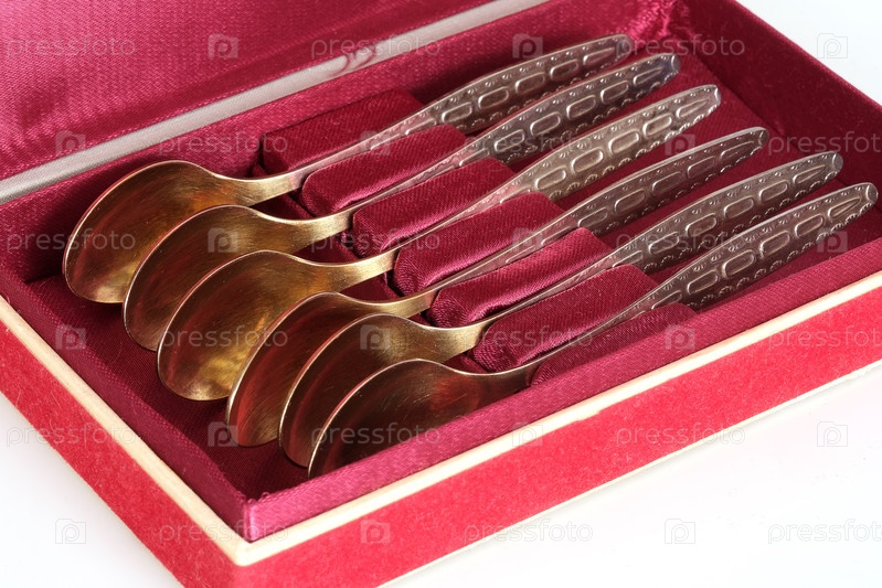 Старые золотые чайные ложки в красной бархатной коробке, изолированной на белом фоне
