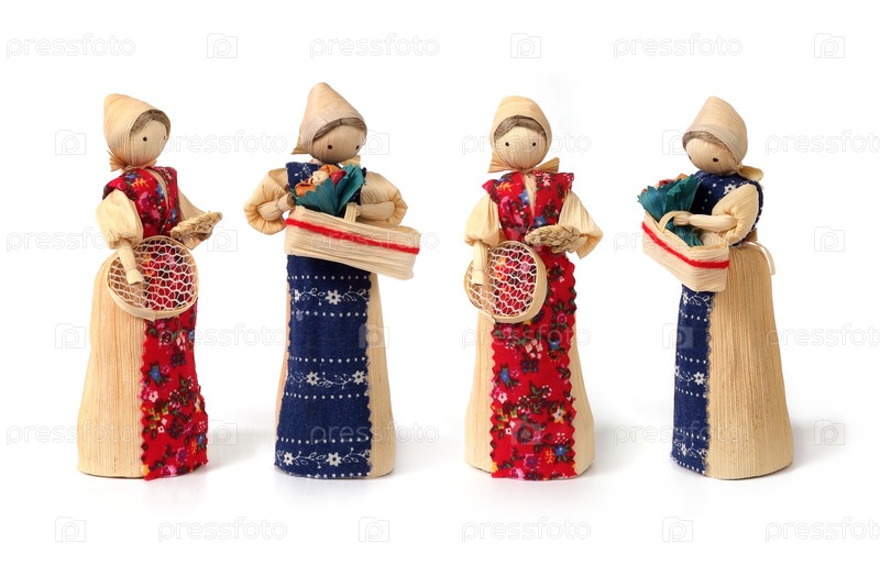 Набор соломенных сувенирных кукол в национальных костюмах, изолированный на белом фоне