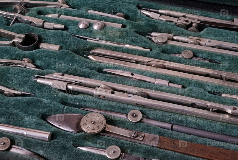 Набор чертежей с помощью инструментов на зеленом бархатном покрытии, вырезка готова. чрезвычайно высокое разрешение