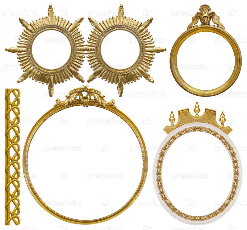 Набор золотых рамок для картин, зеркал или фотографий, изолированных на белом фоне