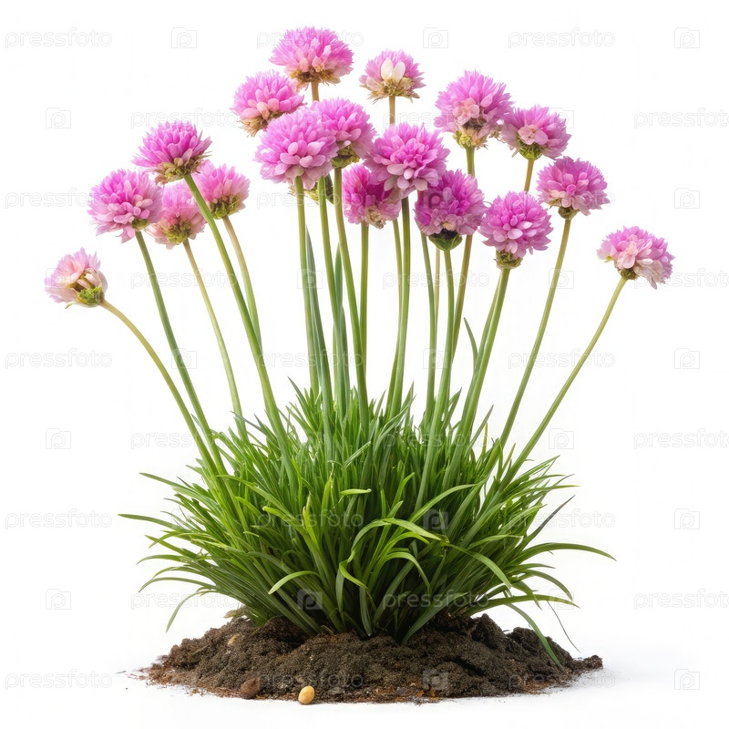 Розовое растение армерии с зеленой травой и почвой, изолированным на белом фоне