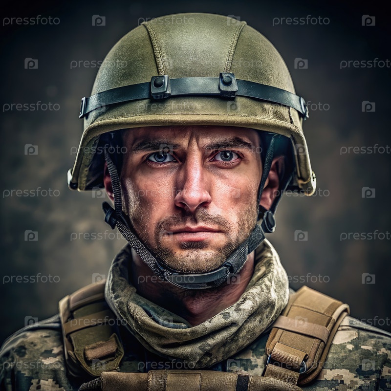 Близкий портрет военнослужащего в шлеме на темном фоне