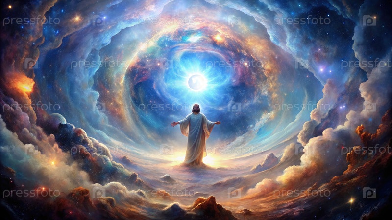 Величественная вихревая туманность с Иисусом, стоящим над облаками