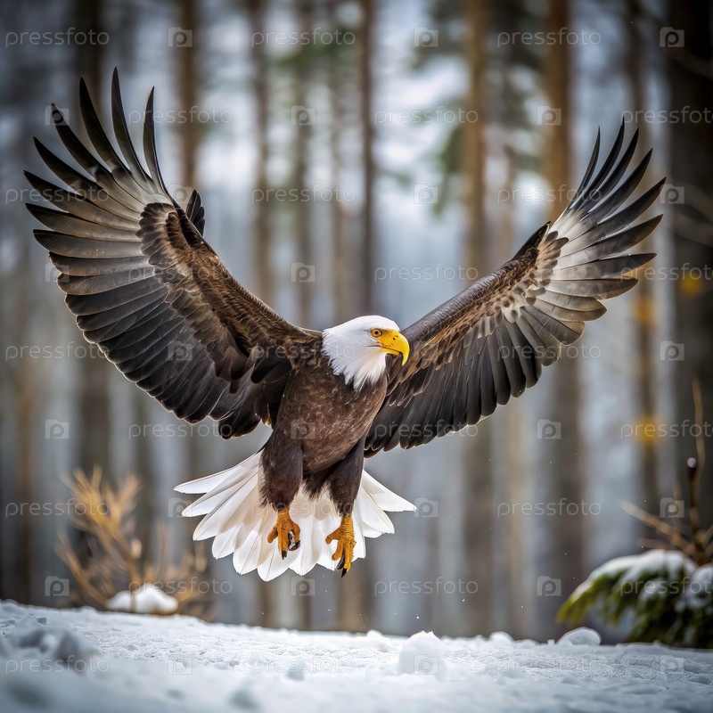 Белый орел приземляется на снежном грунте в зимнем лесу