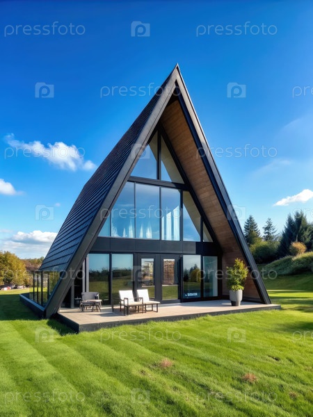 Современный A-Frame House с большими окнами и патио на травяной лужайке