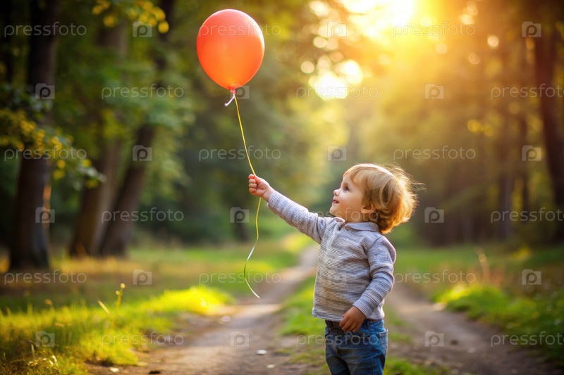 Молодой мальчик держит красный воздушный шар на лесной тропе в солнечный день