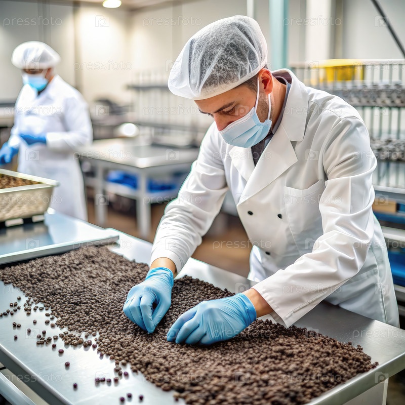 Работник производственной линии проверяет черный перец на пищевом предприятии