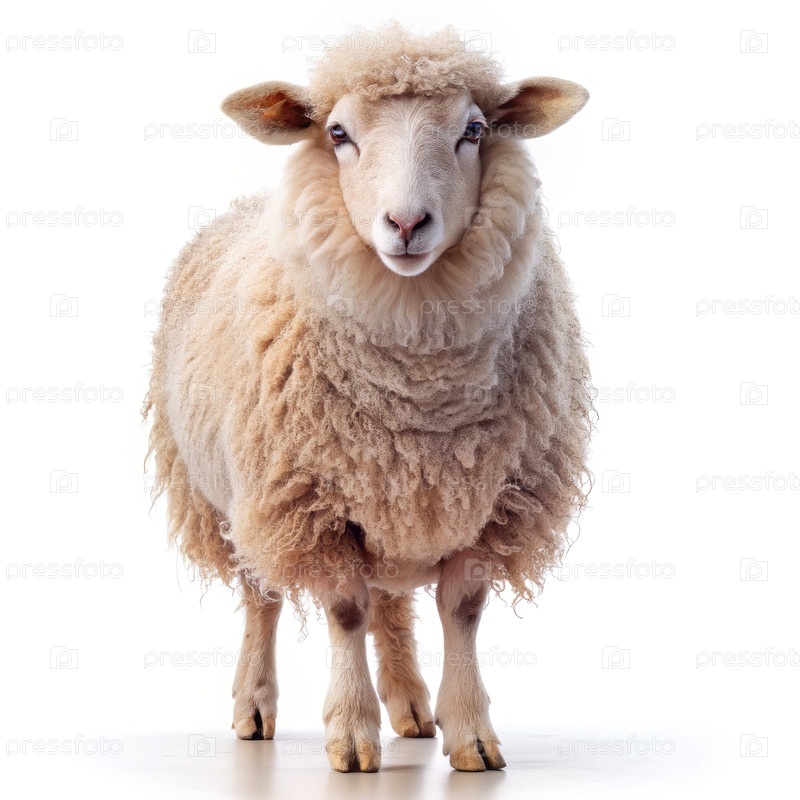 Пушистая белая овца стоит на белом фоне