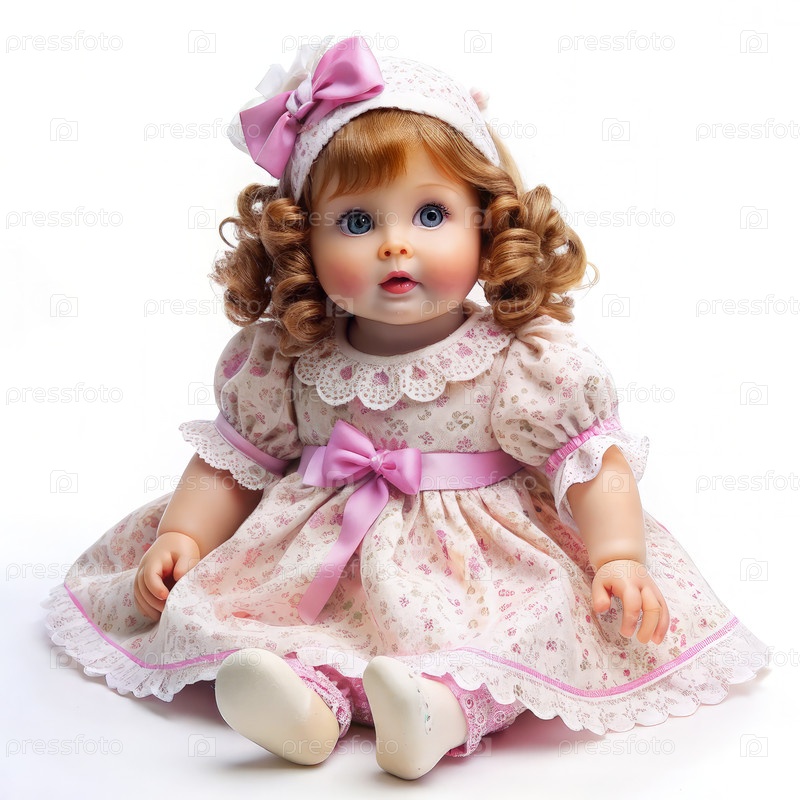 Очаровательная кукла с розовым платьем и луком, сидящая на белом фоне